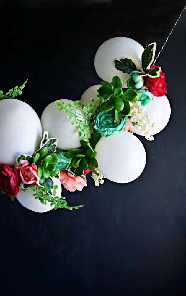Imagem 60 – Diferente e original, esse enfeite de balões brancos traz ainda flores e suculentas artificiais para completar o arranjo.