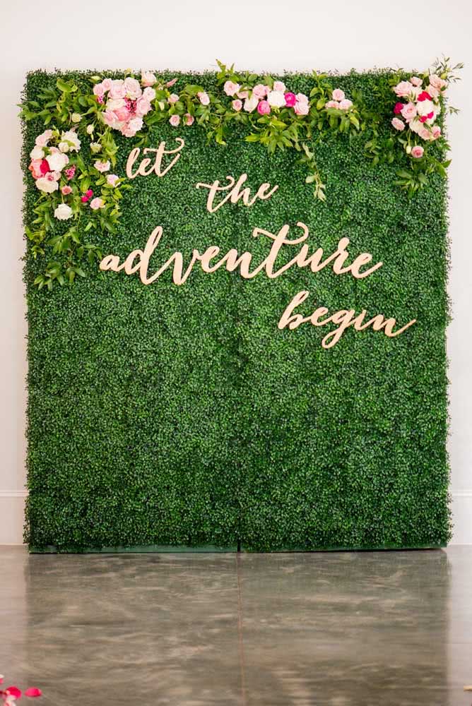 Imagem 2 – Decoração de noivado simples com muro inglês e letreiro luminoso.