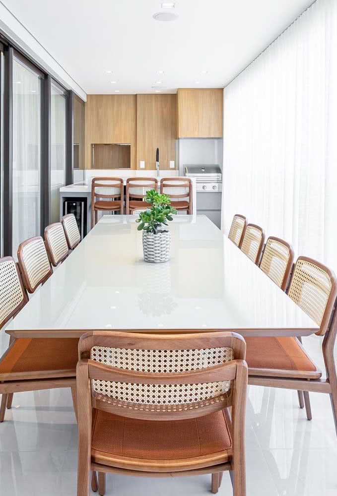 Imagem 30 – Aproveite a metragem ampla e monta uma sala de jantar na varanda.