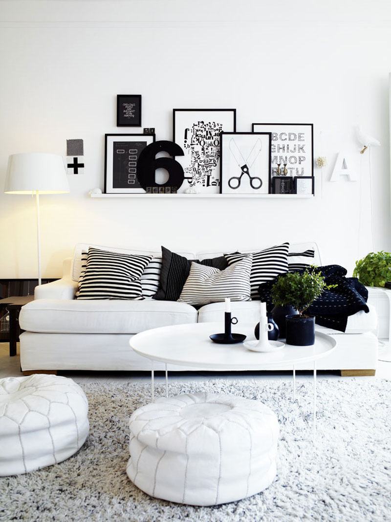 Decoração escandinava com o contraste entre o preto e branco evidente nesta sala.