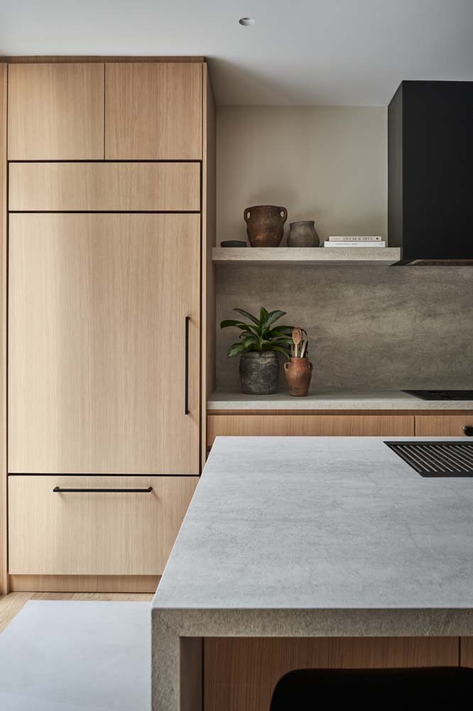 Cozinha ampla e moderna com o estilo escandinavo: linda combinação entre a pedra cinza e a madeira clara.