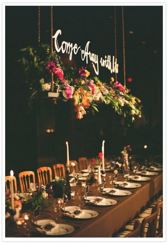 Imagem 27 – Mesa com frase romântica suspensa para decorar festa de noivado