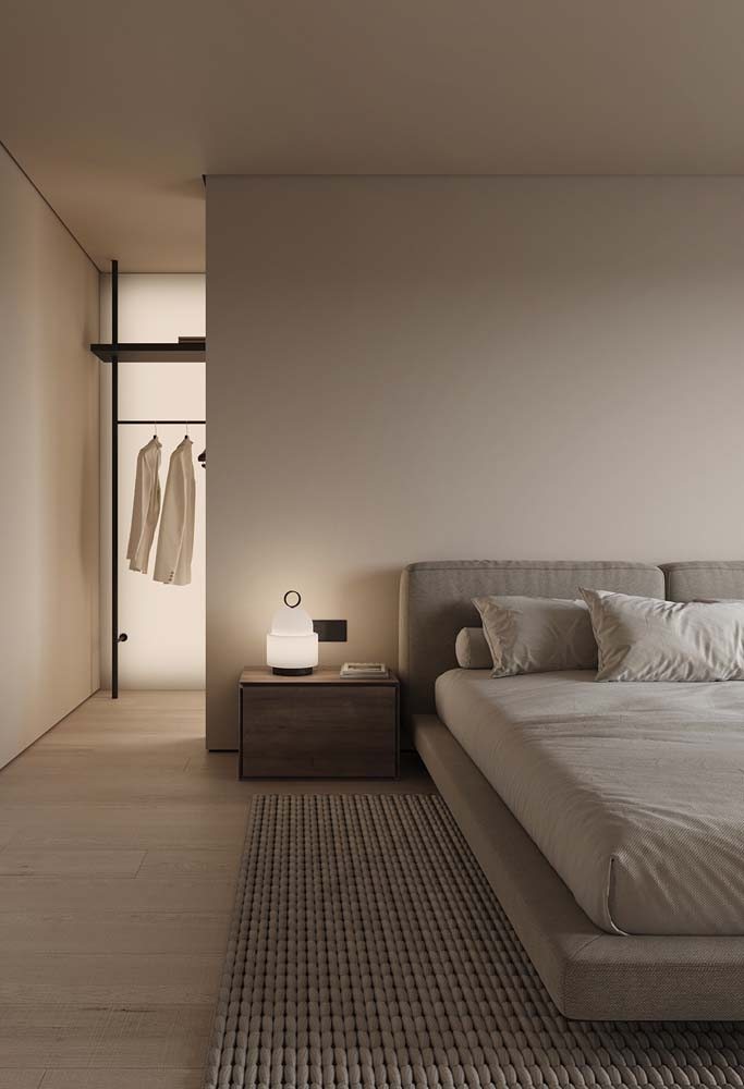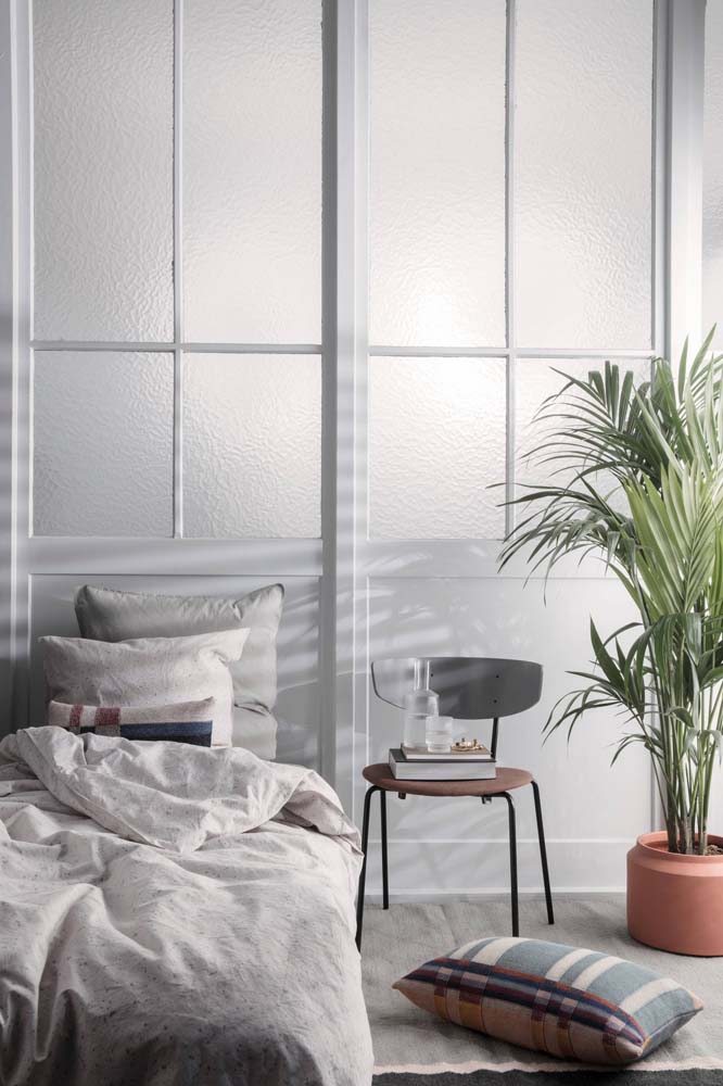 Imagem 9 – O quarto minimalista apostou no vidro jateado como opção de divisória.
