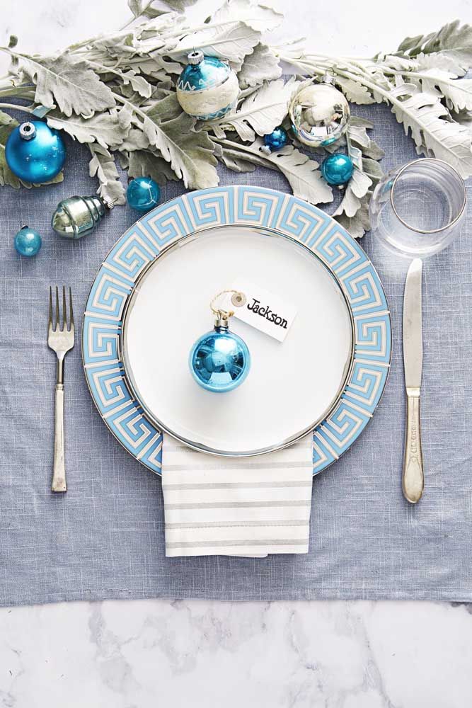 Imagem 50 – Enfeites de Natal para mesa: já aqui nessa mesa de natal, a dupla metálica ganhou a companhia do azul petróleo.