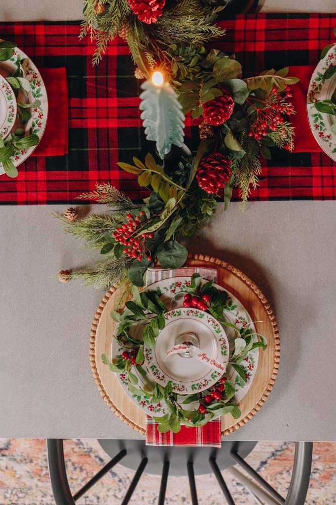 Imagem 21 – O pano xadrez vermelho pede um enfeite de natal para mesa com madeira e tons de verde.