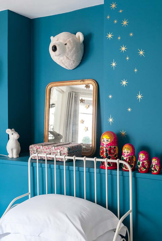 Imagem 60 – Espelho vertical alongado quebra o azul intenso da parede para refletir o branco da parede oposta do quarto.