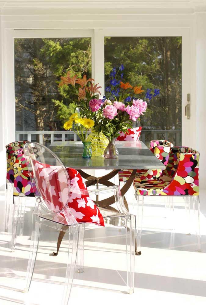 Imagem 61 – A sala de jantar ampla e de base branca ganhou uma estampa floral viva, marcante e para lá de elegante.