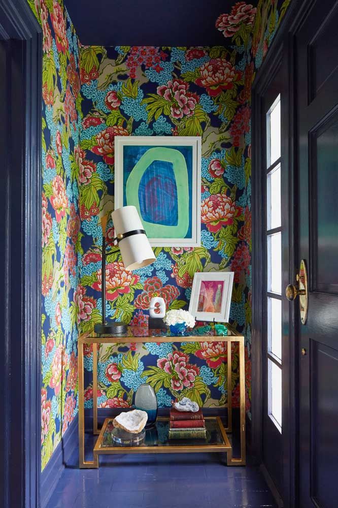 Imagem 57 – O fundo azul da decoração traz força e personalidade para o ambiente complementado com a estampa floral de tons contrastantes.