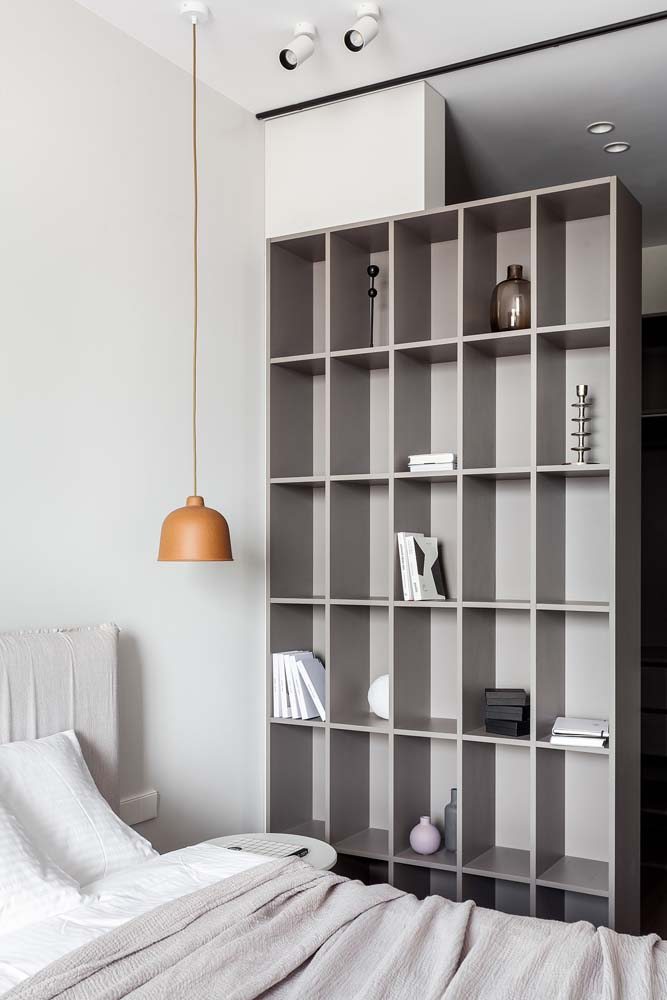 Imagem 49 – Estante com nichos laterais junto ao armário planejado no quarto minimalista.
