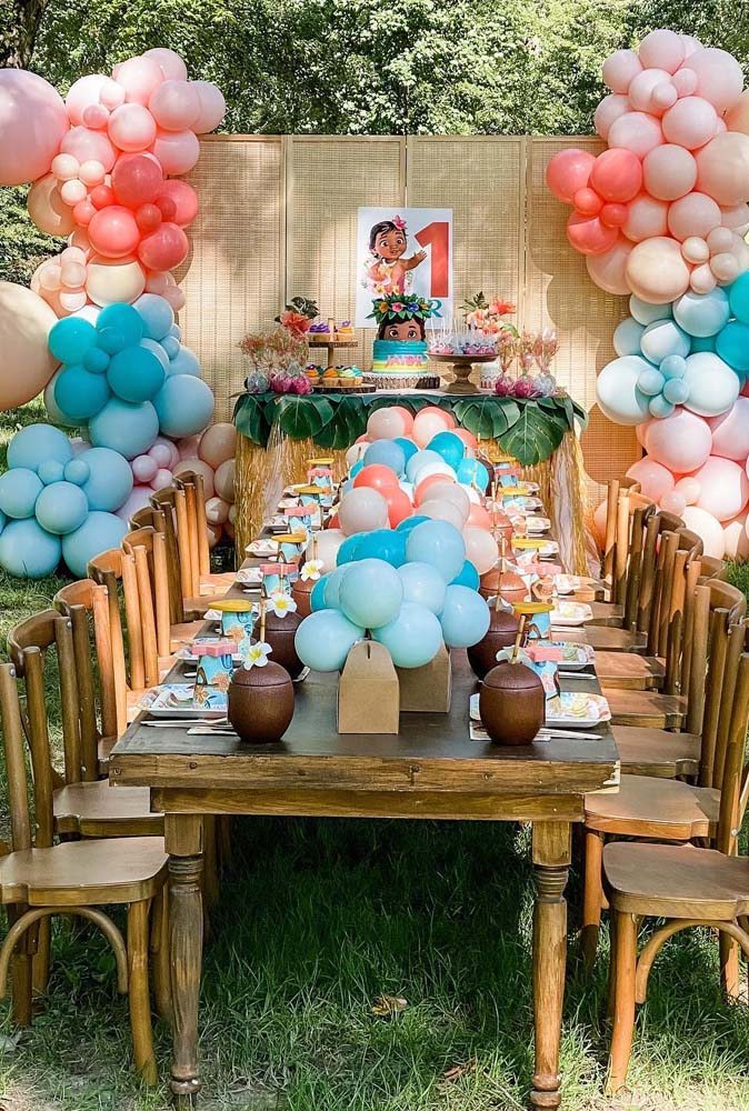Muitas bonecas da moana em diferentes estilos e uma decór com cores bem vivas vão fazer a alegria dos bebês.