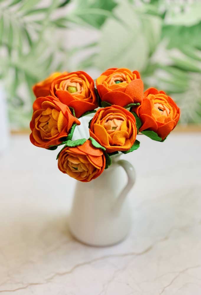 Imagem 71 – Enfeite com lindas flores de feltro com folhas realistas para deixar o arranjo ainda mais interessante.