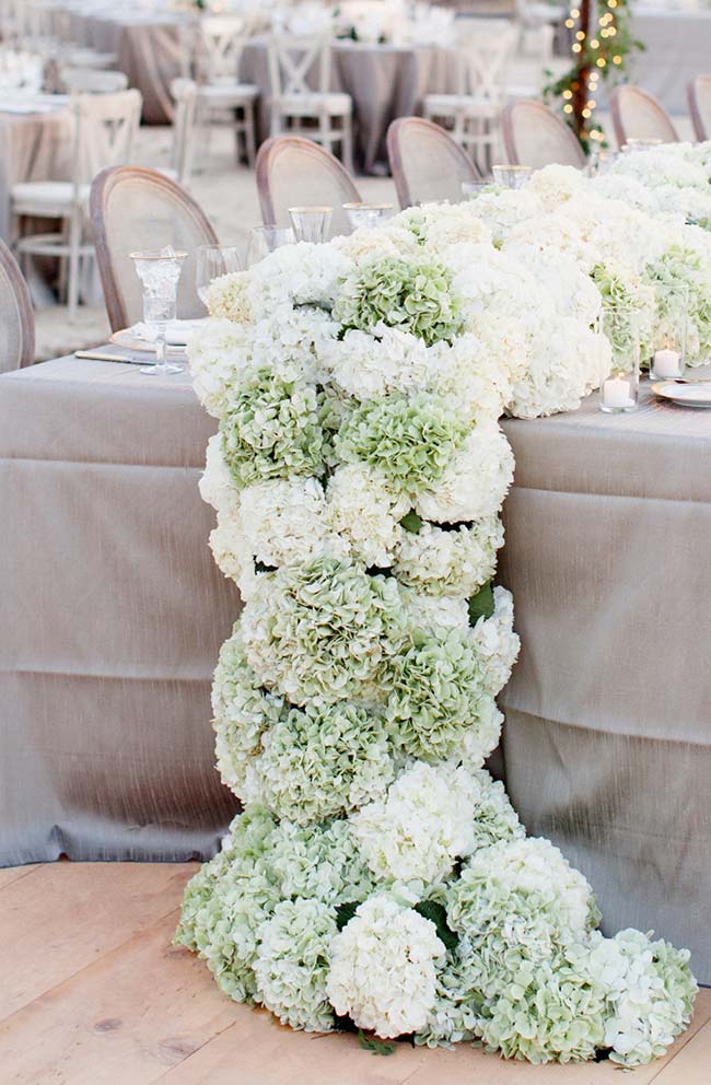 Imagem 35 – Buquês naturais da hortênsia foram usados para montar esse enorme arranjo de mesa.