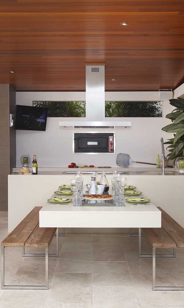 Imagem 25 – Quem diria que uma cozinha moderna e elegante como essa comportaria tão bem a simplicidade do forno a lenha?