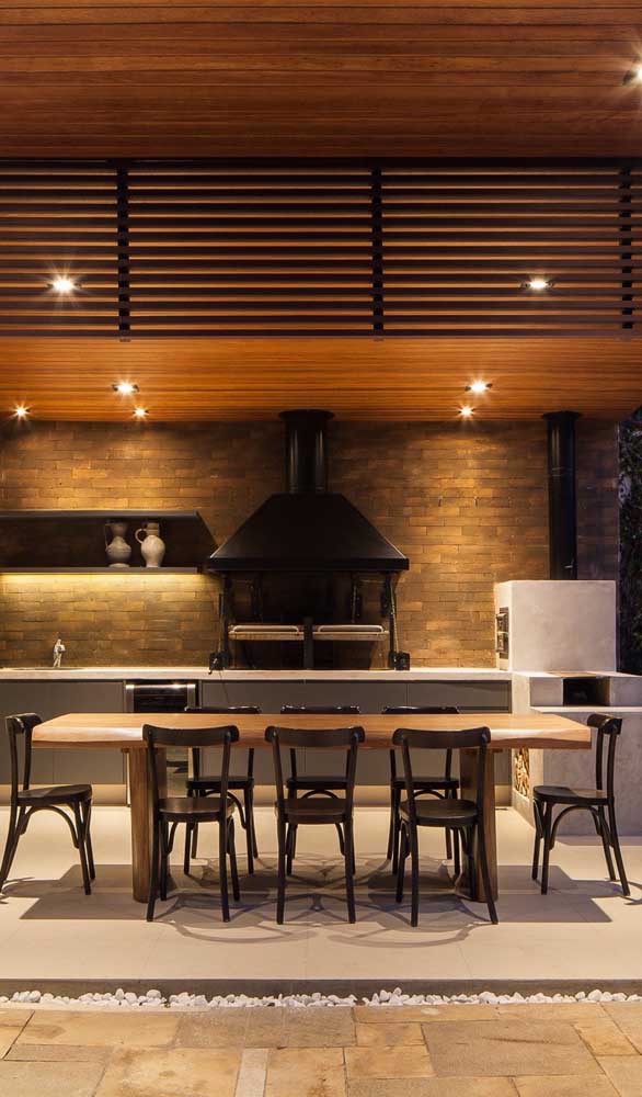 Imagem 23 – Já nesse espaço rústico, o forno a lenha ganhou destaque graças a faixa de revestimento que o acompanha.
