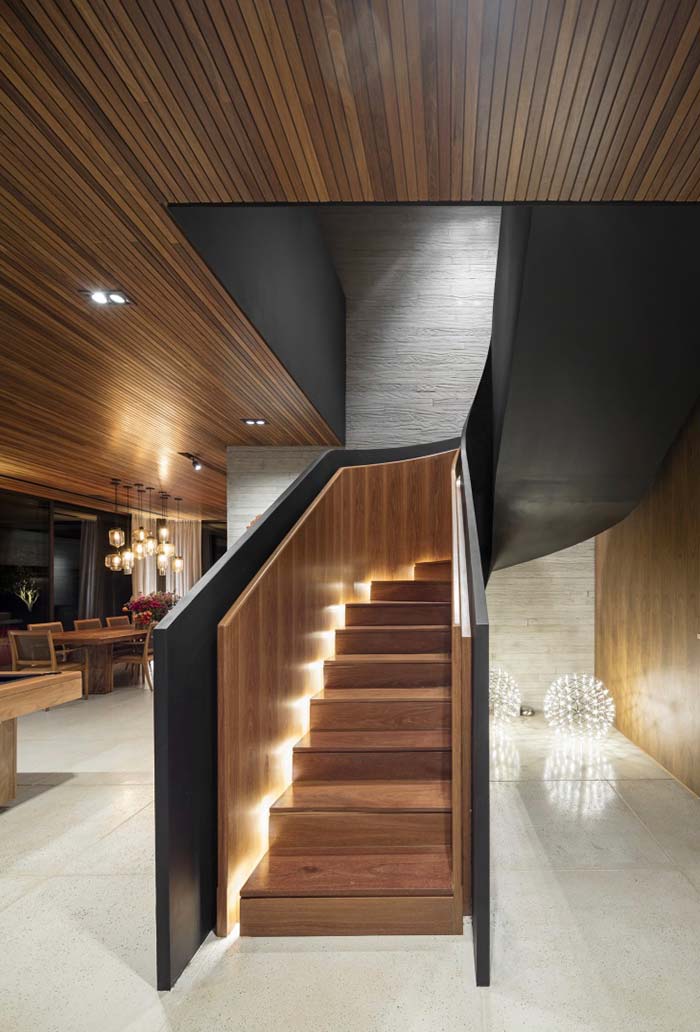 Esse projeto faz um jogo visual interessante. A escada, no mesmo tom do forro, parece se fundir ao teto.