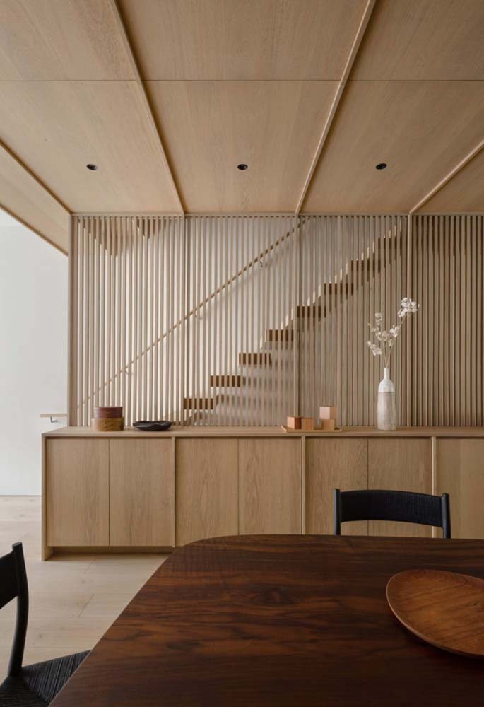Esse forro de madeira possui lâminas tão estreitas que se assemelha a um teto de bambu. Uma alternativa para criar um visual mais rústico e descontraído, em contraste com a decoração de estilo clássica e formal.