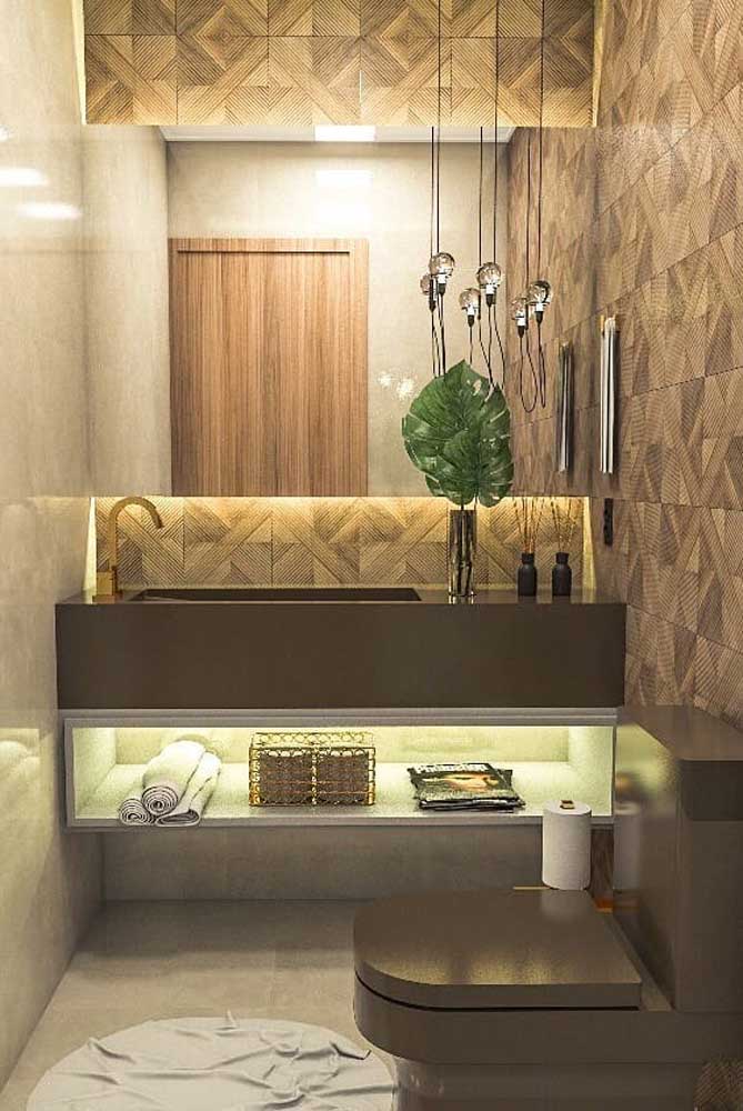 Imagem 47 – Um pouco de dourado para trazer glamour ao banheiro com bancada de granito marrom absoluto.