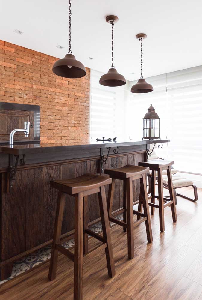 Imagem 45 – Já aqui, o granito marrom absoluto combina com a madeira e os tijolinhos aparentes.