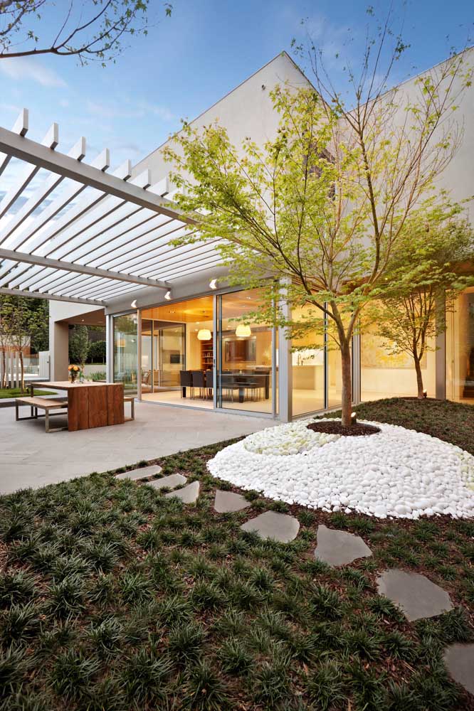Imagem 37 – Pergolado e pedras brancas se destacam nesse projeto de jardim residencial moderno.