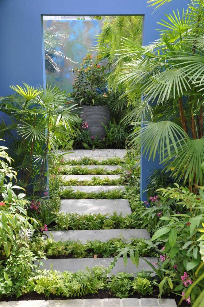 Imagem 52 – O tom azul da parede criou o pano de fundo perfeito para esse jardim residencial.