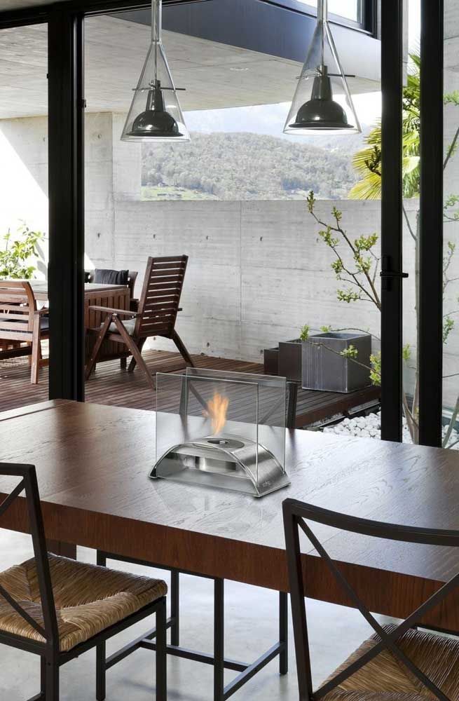 Imagem 3 – Pequena, essa lareira ecológica portátil foi colocada sobre a mesa de jantar, mas pode facilmente ser transportada para outros lugares da casa.