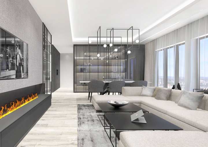 Imagem 20 – Nessa sala, a lareira ecológica se mantem de modo discreto ao lado da mesa de centro.