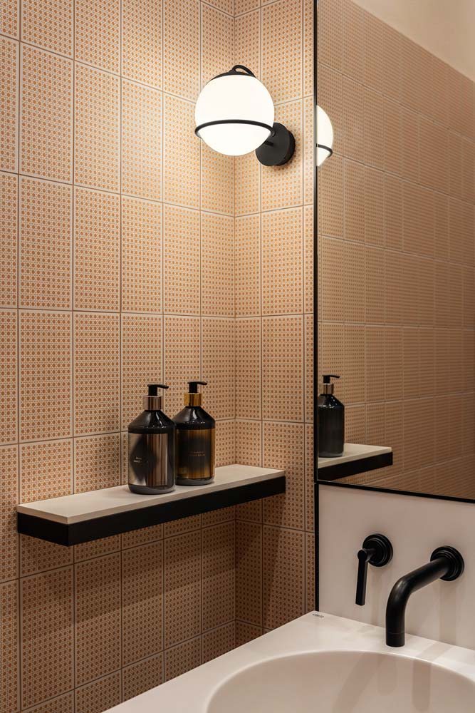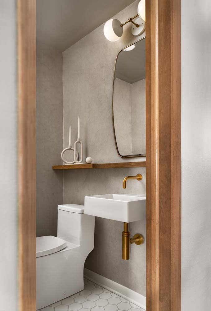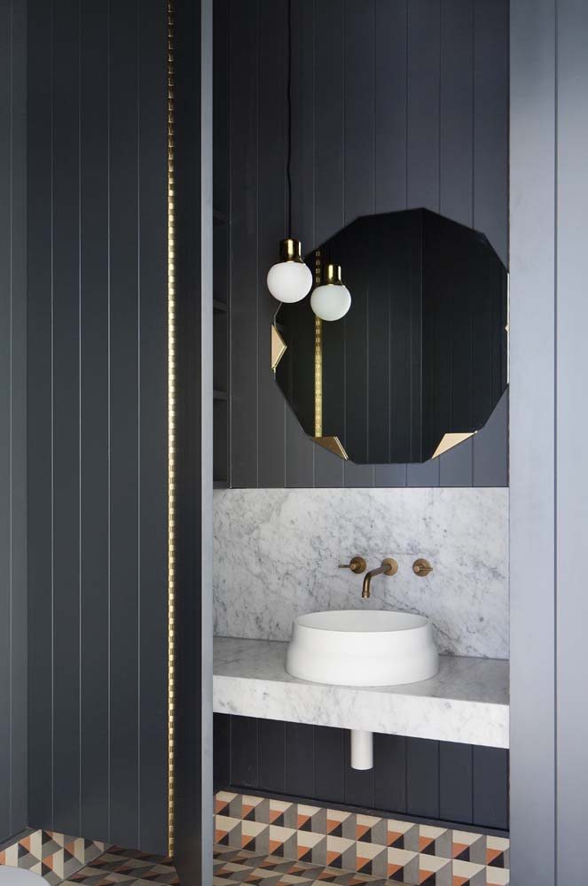 Imagem 35 – O tom de dourado marca presença na torneira, no espelho e na luminária.