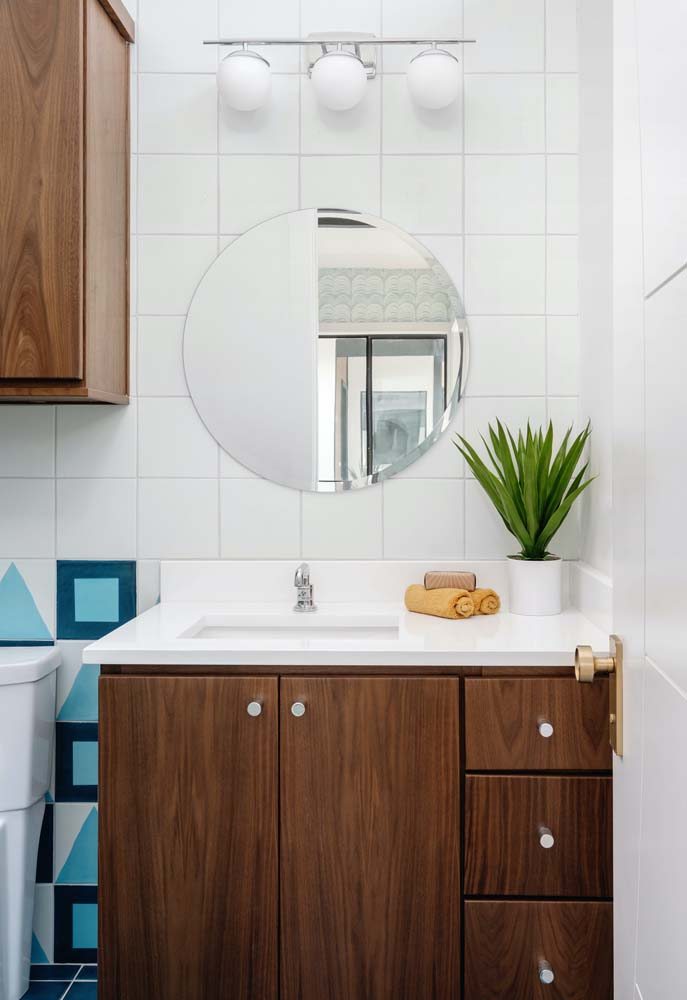 Imagem 26 – Já quem é fã do estilo retrô e rústico pode investir em um lavabo decorado simples com ladrilhos hidráulicos.
