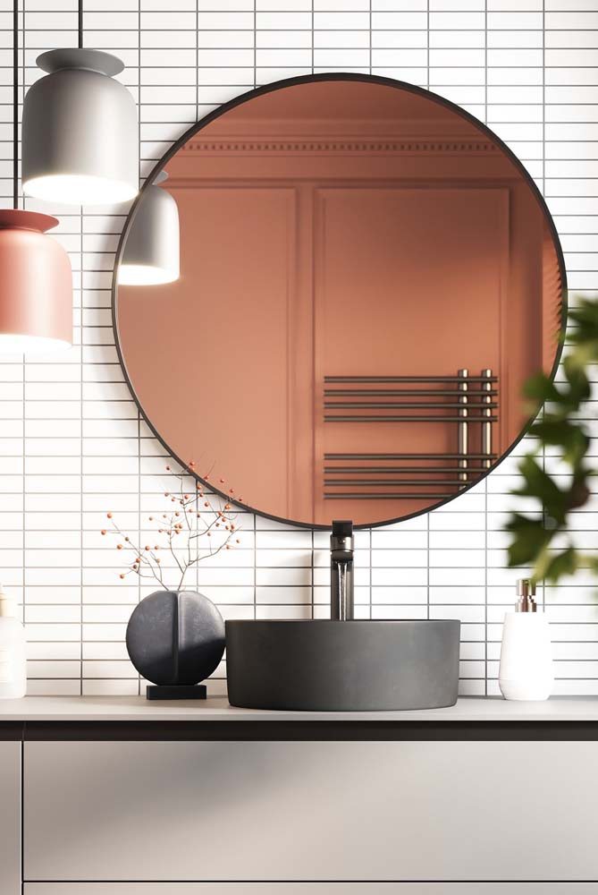 Para usar esse recurso a seu favor, instale pendentes ao lado do espelho, fitas de LED abaixo dos móveis e ao redor do espelho ou, ainda, uma arandela de parede.