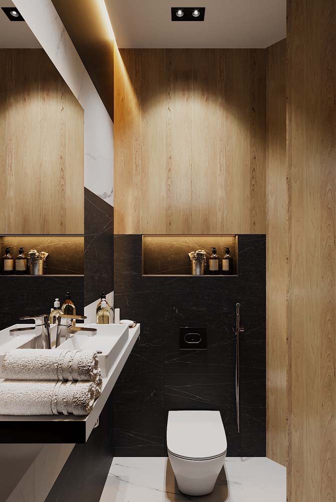 Imagem 54 – Já aqui, a dica é revestir as paredes do lavabo com madeira.