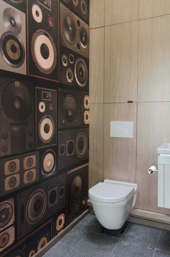Imagem 15 – Que inspiração diferente e original para um lavabo! O adesivo para a parede trouxe alto falantes na estampa.