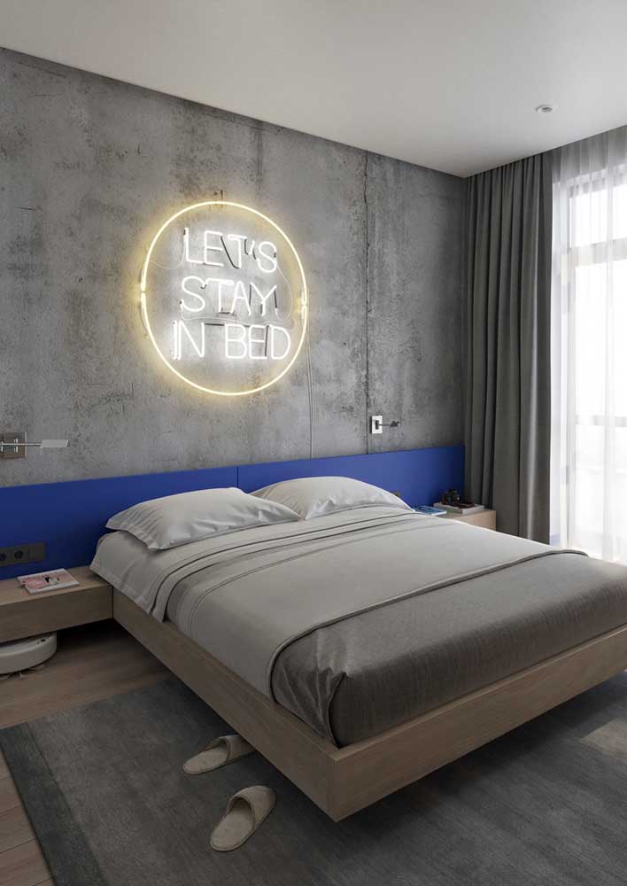 Imagem 1 – Quarto de casal moderno com letreiro de neon na parede de cimento queimado.
