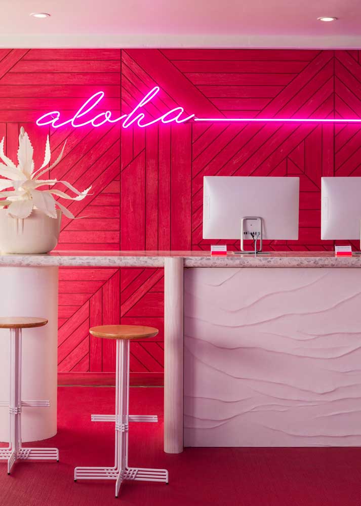 Imagem 2A – O longo corredor rosa traz um letreiro luminoso de neon bem aos fundos.