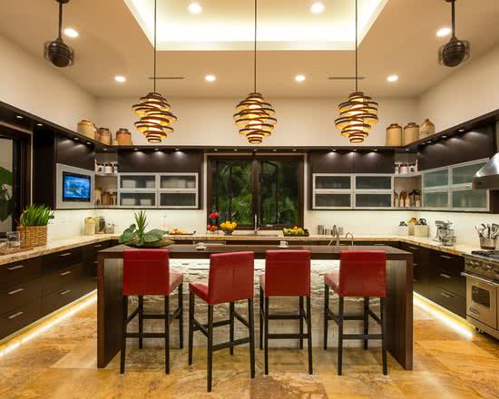 Os formatos de luminárias para cozinha são variados, por isto, acreditamos que sempre há uma opção adequada para qualquer ambiente. Vale lembrar que se deve considerar as instalações elétricas e o forro de gesso, assim como suporte necessário, dependendo do tamanho do acessório.