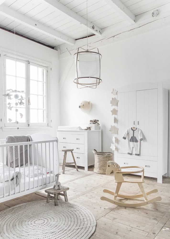 Imagem 54 – Quarto de bebê em estilo escandinavo com lustre pendente de cristal.