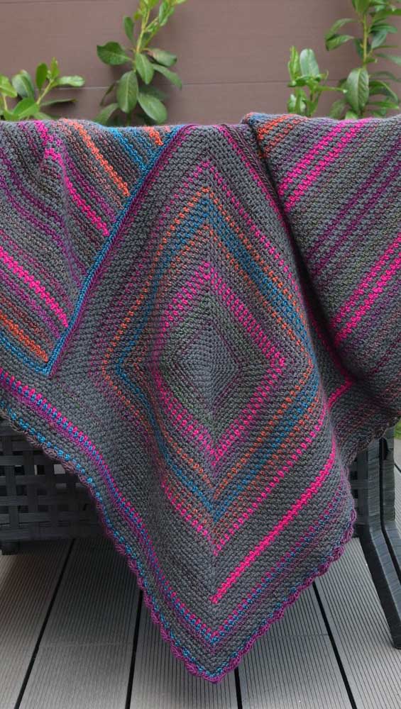 Imagem 32 – E que tal um modelo de manta de crochê em tons escuros e vibrantes? Lindo contraste!