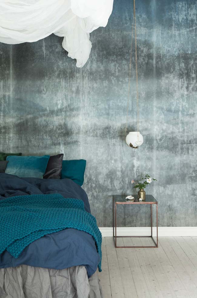 Imagem 44 – Parede do quarto de casal com efeito marmorizado mesclado nas cores cinza e azul.