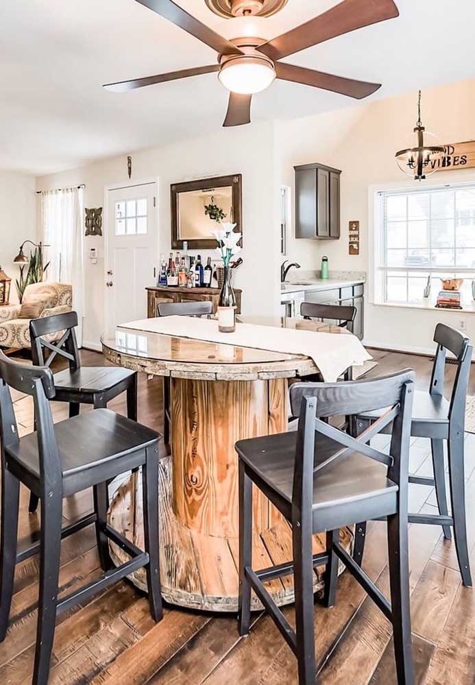 Imagem 59 – Cadeiras de estilo variado circulam essa charmosa mesa de carretel.