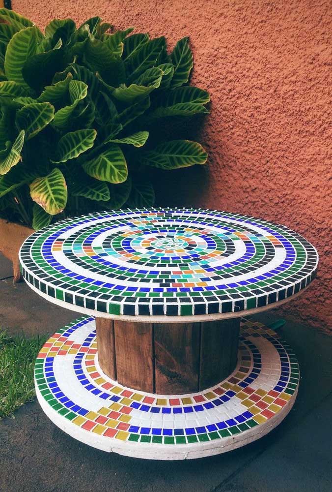 Imagem 37 – Bonita, criativa e lúdica: essa mesa de carretel apostou no uso de mosaicos coloridos no tampo.