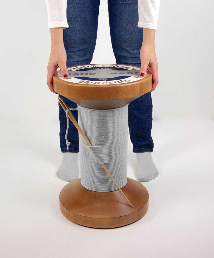 Imagem 4 – Mesa de carretel para o quarto; repare no acabamento da estrutura com tiras de sisal.