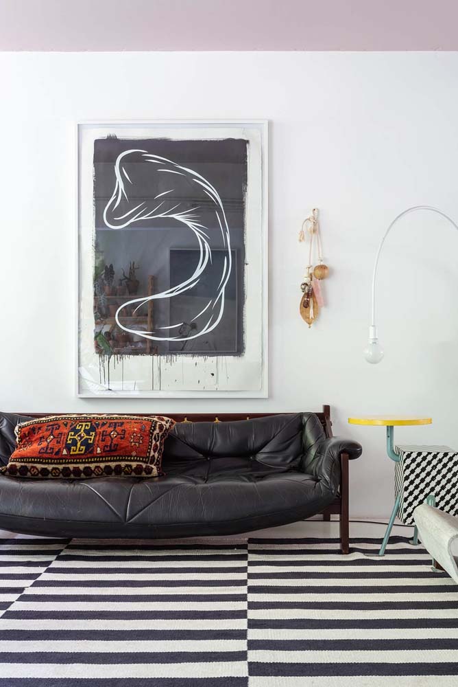 Imagem 40 – Mini sofá baixo em base de madeira preta para uma sala preto e branca.