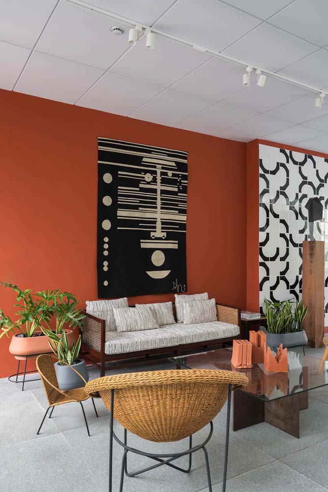 Imagem 39 – Espaço com pintura vermelha e sofá de madeira com estofado de tecido.