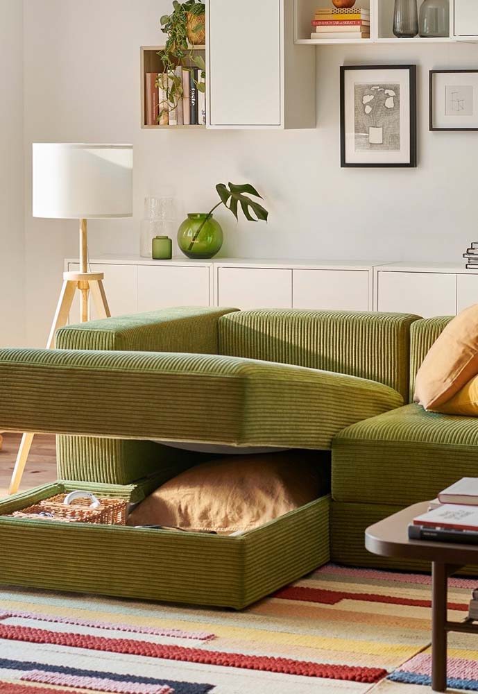 Outra modalidade de sofá quem tem feito sucesso é o modelo com nichos e gavetas.