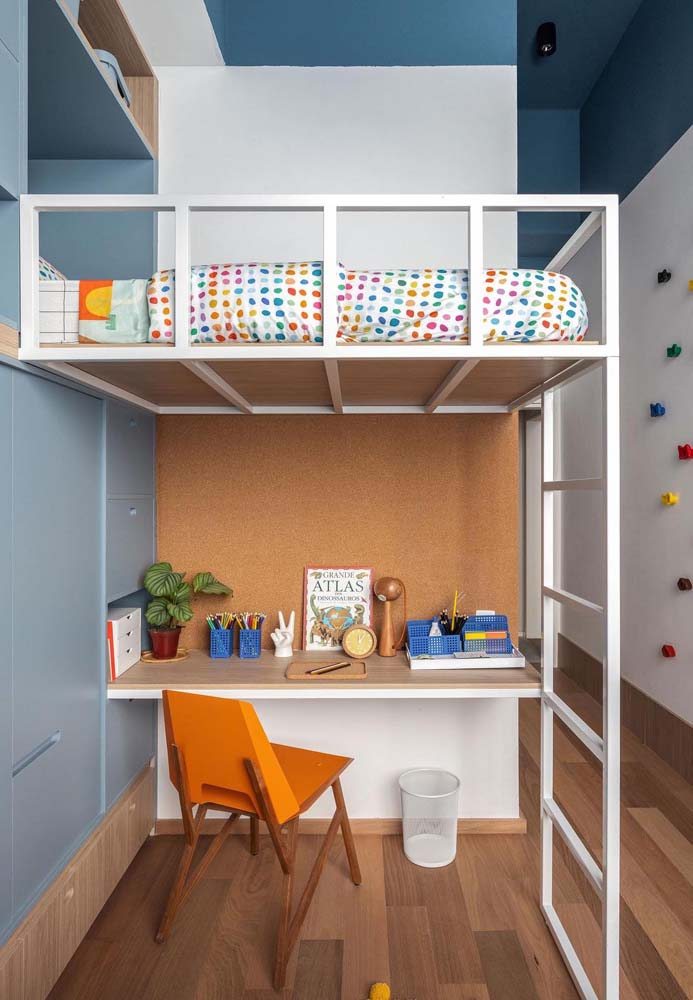 O quarto das crianças costuma ter uma área bem reduzida, mas é possível driblar a falta de espaço apostando no uso de uma cama beliche com escrivaninha embaixo e armários nas laterais.