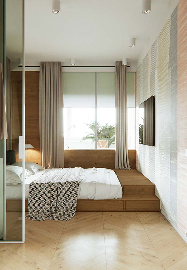 Imagem 17 – Nesse quarto, a base de madeira serve de encaixe para a cama e de passagem até a janela e a TV.
