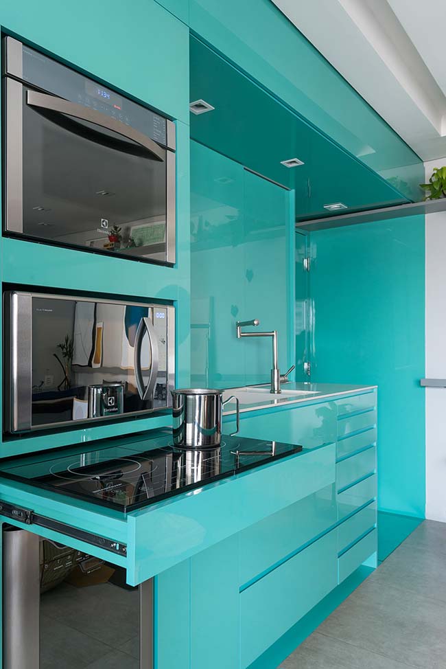 Imagem 28 – Nessa cozinha azul toda laqueada, o cooktop de indução fica guardadinho no armário depois do uso.