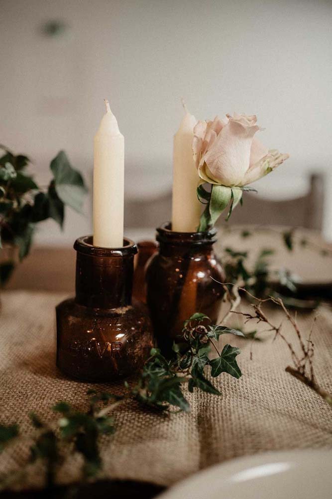 O noivado rústico ainda tem a vantagem de aceitar muito bem projetos DIY e o uso de materiais recicláveis que, além de te fazer economizar uma graninha, ainda ficam lindos no décor! Nesse sentido, aposte em garrafas de vidro decoradas, latinhas, potes de vidro com velas dentro e por aí vai.