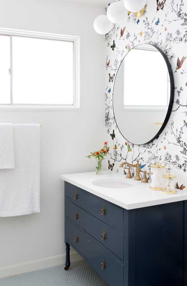 Você também pode optar por usar papel de parede lavável ou papel de parede adesivo para o lavabo. Mas mesmo que utilize um papel de parede tradicional, saiba que todos eles são muito simples de serem colocados e você mesmo pode fazer isso, atentando-se apenas para evitar a formação de bolhas.