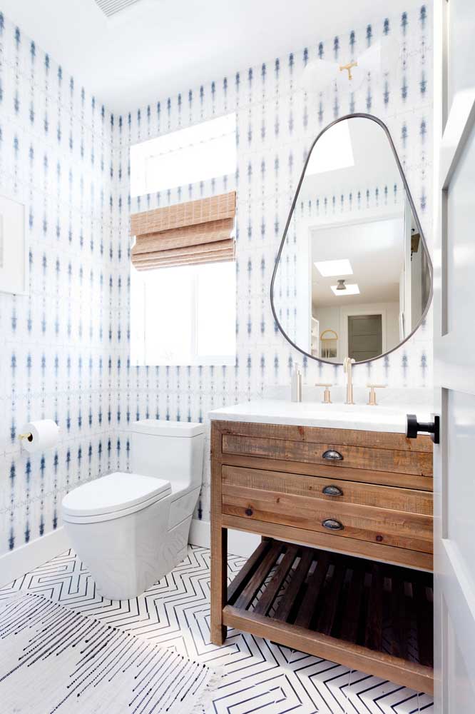 Imagem 45 – Padrões geométricos no papel de parede são a melhor aposta para um lavabo moderno; repare o efeito que ele causa ao ser refletido pelo espelho.