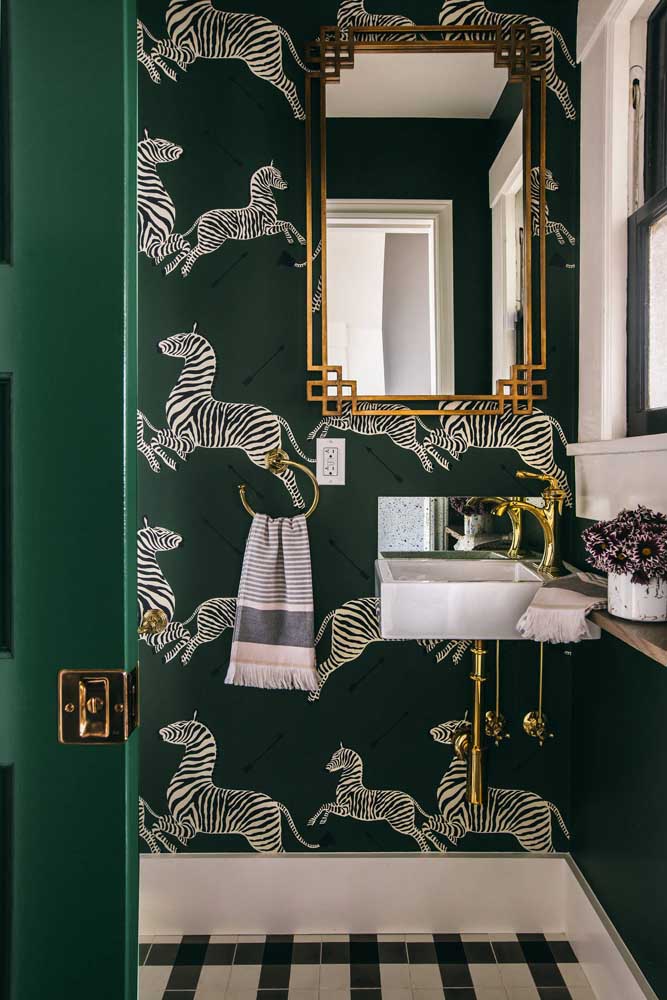 Imagem 47 – Estampa de zebra no papel de parede para lavabo; um modo criativo de usar papel de parede com tema animal sem cair no lúdico ou no infantil.